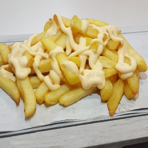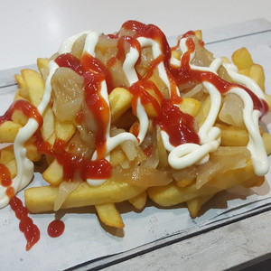 Patatine fritte stick con cipolla caramellata, ketchup e maionese